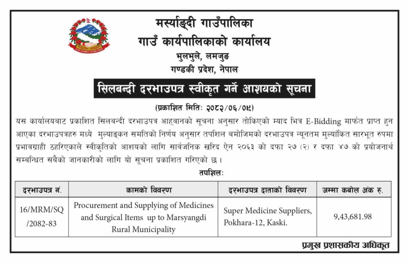 सिलबन्दी दरभाउपत्र स्वीकृत गर्ने आशयको सूचना ।।।