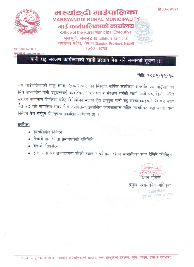 मर्स्याङ्दी क्षेत्राधिकार भित्रको नदिजन्य पदार्थ (ढुङ्गा, गिटि, बालुवा आदि) संकलन/उत्खनन् तथा विक्री सम्बन्धी सिलबन्दी दरभाउपत्र आह्वानको सूचना ।।।