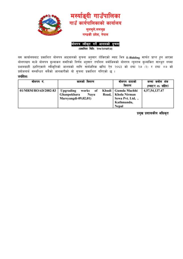 वोलपत्र स्वीकृत गर्ने आशयको सुचना ( खुदी घनपोखरा नायु सडक स्तरोन्नती)